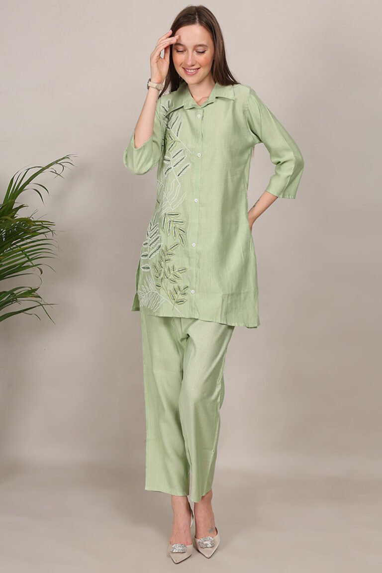 Vertigan Silk Pastel Green Casual Wear Stylish Readymade Cord Set